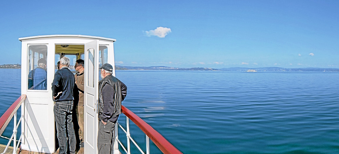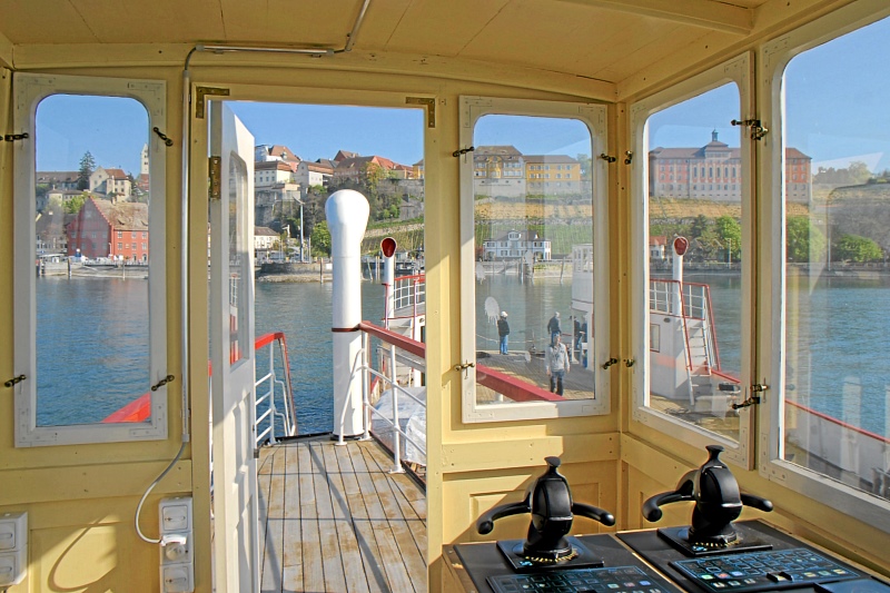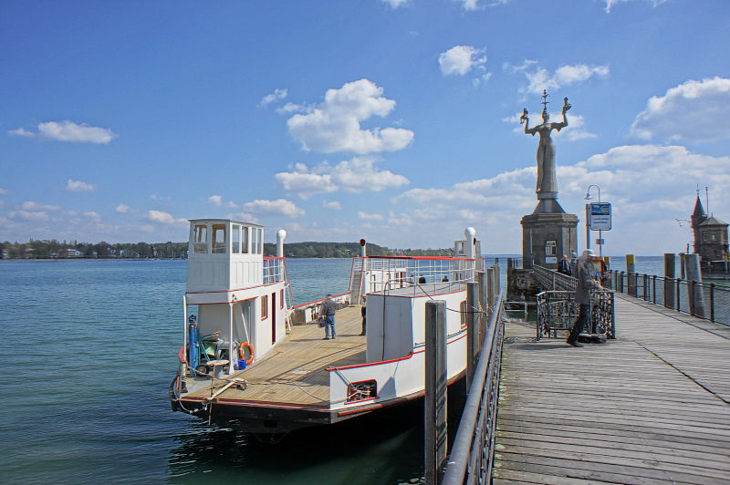 Einige Wochen durfte die alte Fähre im Meersburger BSB-Hafen (dem Hafen für die Kursschiffe) verbringen. Grund dafür war, dass der Wasserstand des Sees so niedrig war, dass an ihrem Anleger Grundberührung zu befürchten war. Nachdem die Kursschiffahrt aber demnächst beginnt, musste sie diesen schönen Platz wieder frei machen, und so fuhr man bei schönsten Wetter gen Konstanz, wo sie kurzfristig direkt unterhalb der Imperia vertäut wurde.