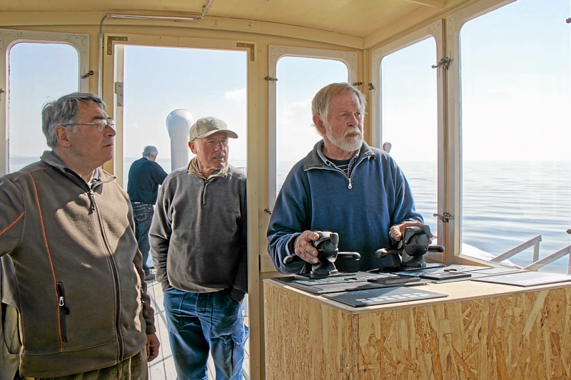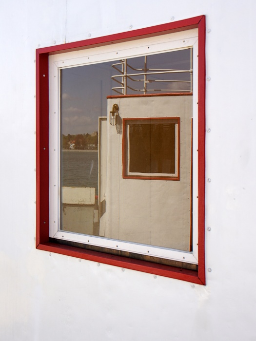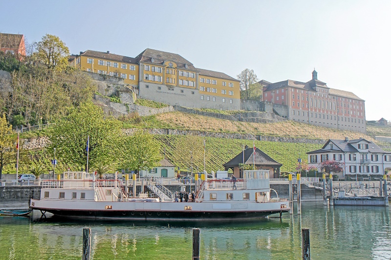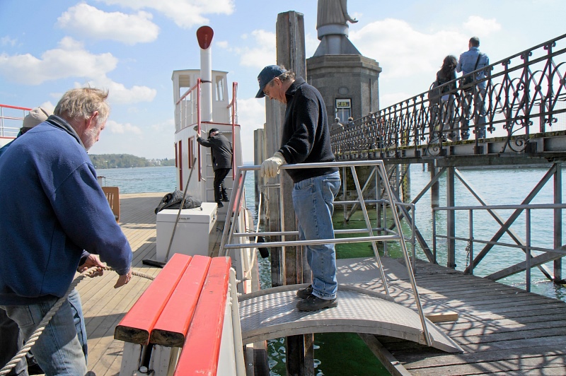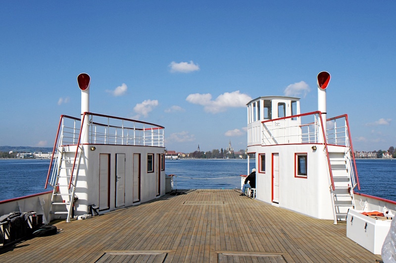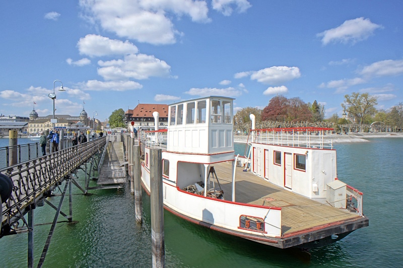Einige Wochen durfte die alte Fähre im Meersburger BSB-Hafen (dem Hafen für die Kursschiffe) verbringen. Grund dafür war, dass der Wasserstand des Sees so niedrig war, dass an ihrem Anleger Grundberührung zu befürchten war. Nachdem die Kursschiffahrt aber demnächst beginnt, musste sie diesen schönen Platz wieder frei machen, und so fuhr man bei schönsten Wetter gen Konstanz, wo sie kurzfristig direkt unterhalb der Imperia vertäut wurde.